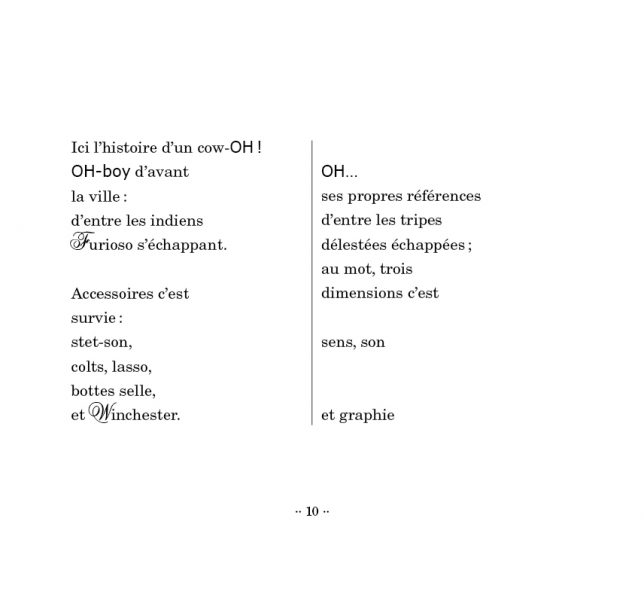 Ça tombe bien, il y a d’un côté un recueil imprimé composé de deux colonnes et de l’autre un CD. Enregistrement nécessaire pour une raison simple : deux voix se répondent et parfois se mêlent. Et je ne vous apprendrai rien en vous disant qu’il est impossible de lire deux textes en même temps, alors qu’on peut les entendre. C’est l’épopépoème. Et puis sur la page, il y a d’un coté l’épopée du cow-boy et de l’autre le poème du poète qui commente le poème s’écrivant (ou se lisant), toujours en parallèle, en écho l’un avec l’autre.