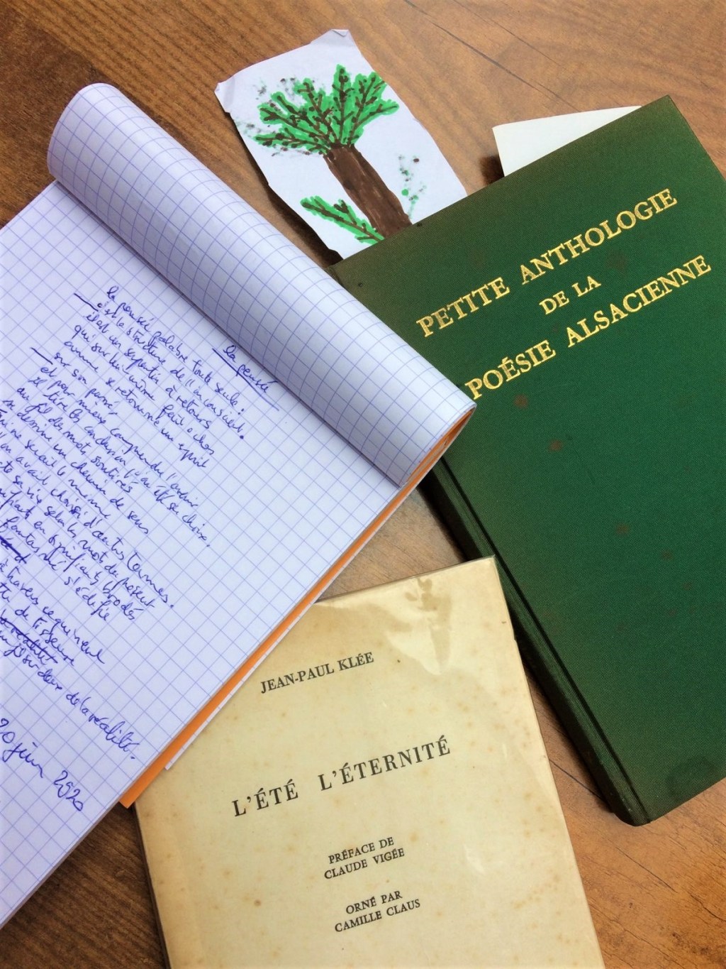 Mot Ment intimiste ce samedi. À trois autour des verres, accompagnés en fin de partie par une averse qui a terrassé notre farniente en terrasse. D’un côté : « la pensée » d’Apolline, de l’autre : la suite du road-trip de Fred. Et entre les deux un poème de Jean-Paul Klée tiré de son premier recueil « L’été l’éternité » (1970) déniché par René-Ralf et un autre d’André Weckmann choisi dans la « Petite anthologie de la poésie alsacienne » (1976) trouvée par Fred. Ça a parlé de Jean-Michel Maulpoix aussi, de documentaliste à la centrale de Fessenheim, de Saint-Louis et de Mulhouse, de mariage et de paternité, de reconversion professionnelle et de bien d’autres choses. La poésie au sens large quoi !