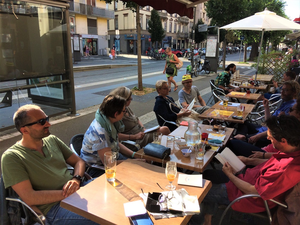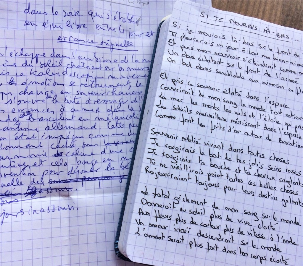 Mot Ment partagé entre légèreté et gravité ce samedi. La faute à Fred qui avait ramené avec lui du Jacques Rigaut dont on a lu le poème « Agence générale du suicide » et quelques aphorismes qui n’avaient rien à envier à Cioran. Mais comme pour ce bon vieux Emil, Rigaut c’est surtout très drôle. Gravité… et légèreté donc. Alex. S. sous son bob cacolac fétiche nous a lu un extrait d’ « Ici en exil » d’Emmanuel Merle et le poème « Dulce et decorum est » du poète anglais décédé à 25 ans pendant la 1ère GM Wilfred Owen. Gravité. La faute à René-Ralf qui avait ramené avec lui son objet le plus précieux, le carnet dans lequel il recopie ses poèmes favoris depuis ses 16 ans, pour lire un poème à Lou d’Apollinaire qui fait du sang une source de fleurissement. Gravité… et beauté. Apolline a lu quant à elle deux de ses nouvelles compositions : « Errance originelle » et « En équilibre ». Métaphysique. Ont aussi été lus par Claire-Marie, Lydia, René-Ralf et Murielle des extraits des recueils « Nina, Simone » d’Alice Ramier, « Les Hybrides » et « Le Carillon zen » de Lydia Kowicz-Loriot, « Je vais simplement m’habiller comme tout le monde » d’Hugo Pernet et « L’homme qui marche » de Christian Bobin. Gravité ou légèreté ? Poésie !