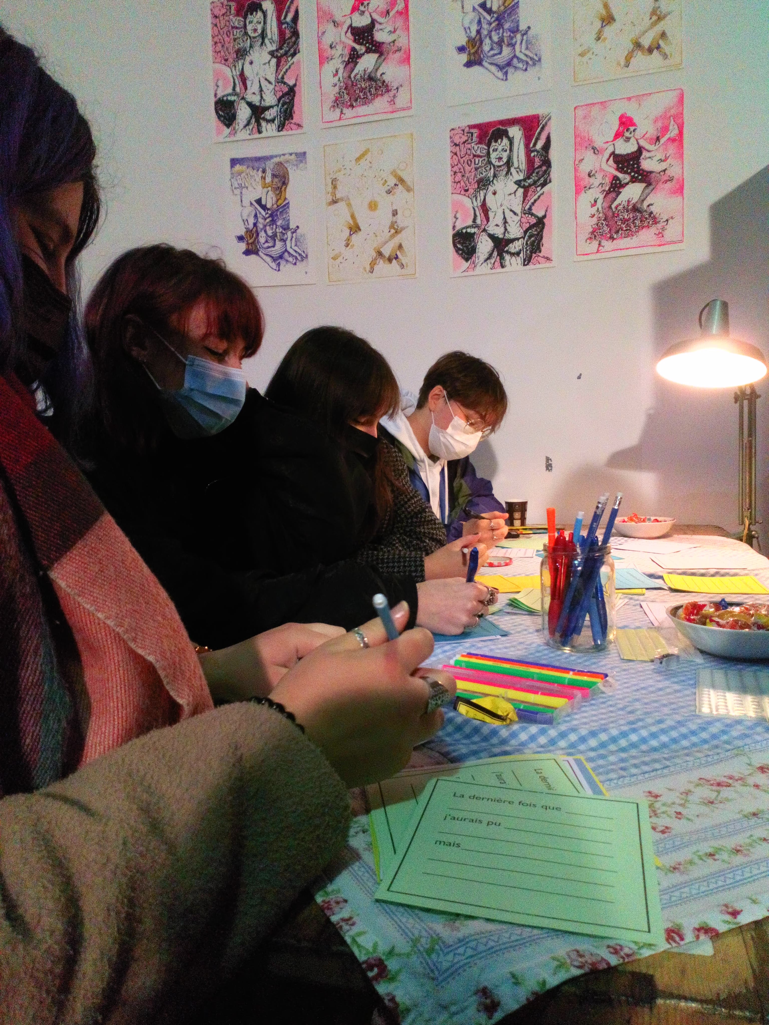 Une douzaine de textes à trous différents avaient été préparés par nos soins, de manière à permettre à chacun·e de s’exprimer librement, tout en évitant le syndrome de la page blanche.